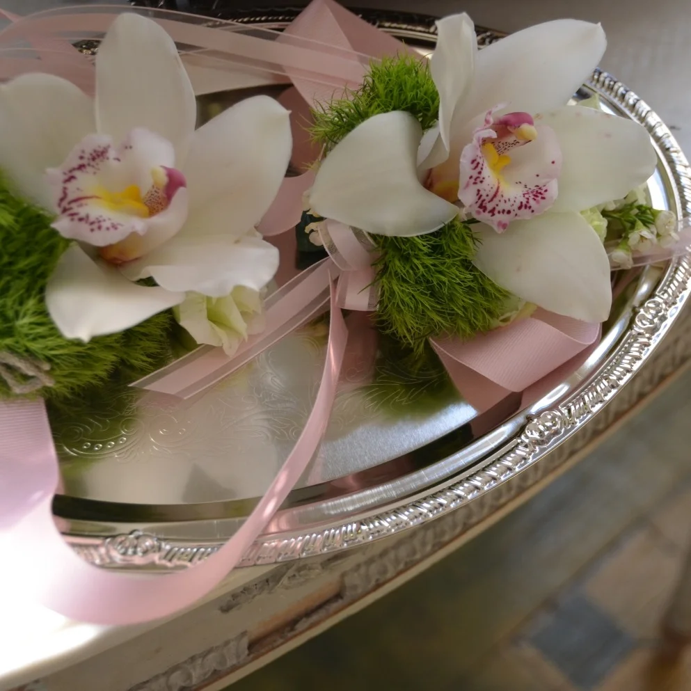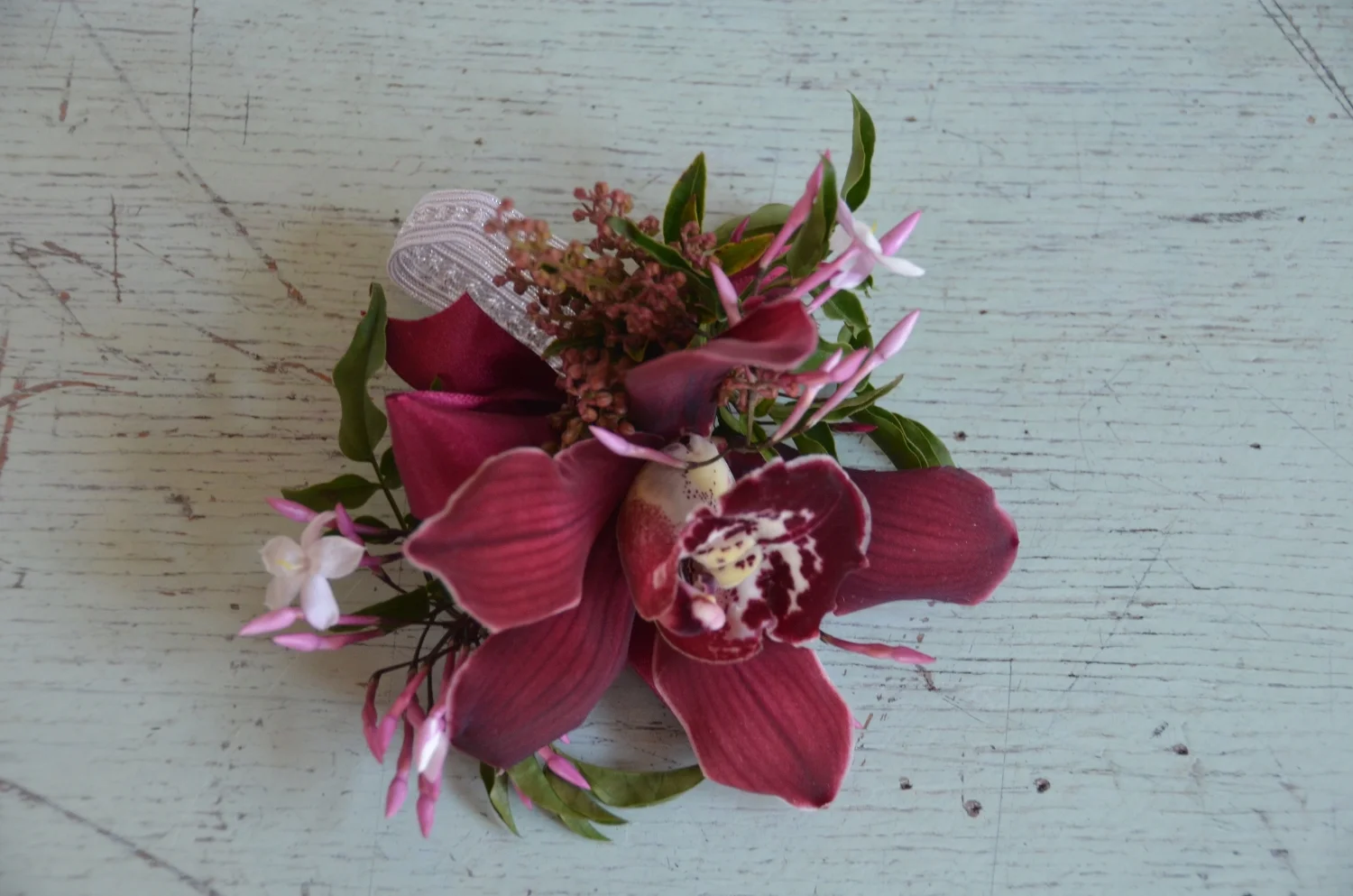 An elegant wrist or pin on corsage to acknowledge and delight special guests and provide classic glamour with a contemporary edge.